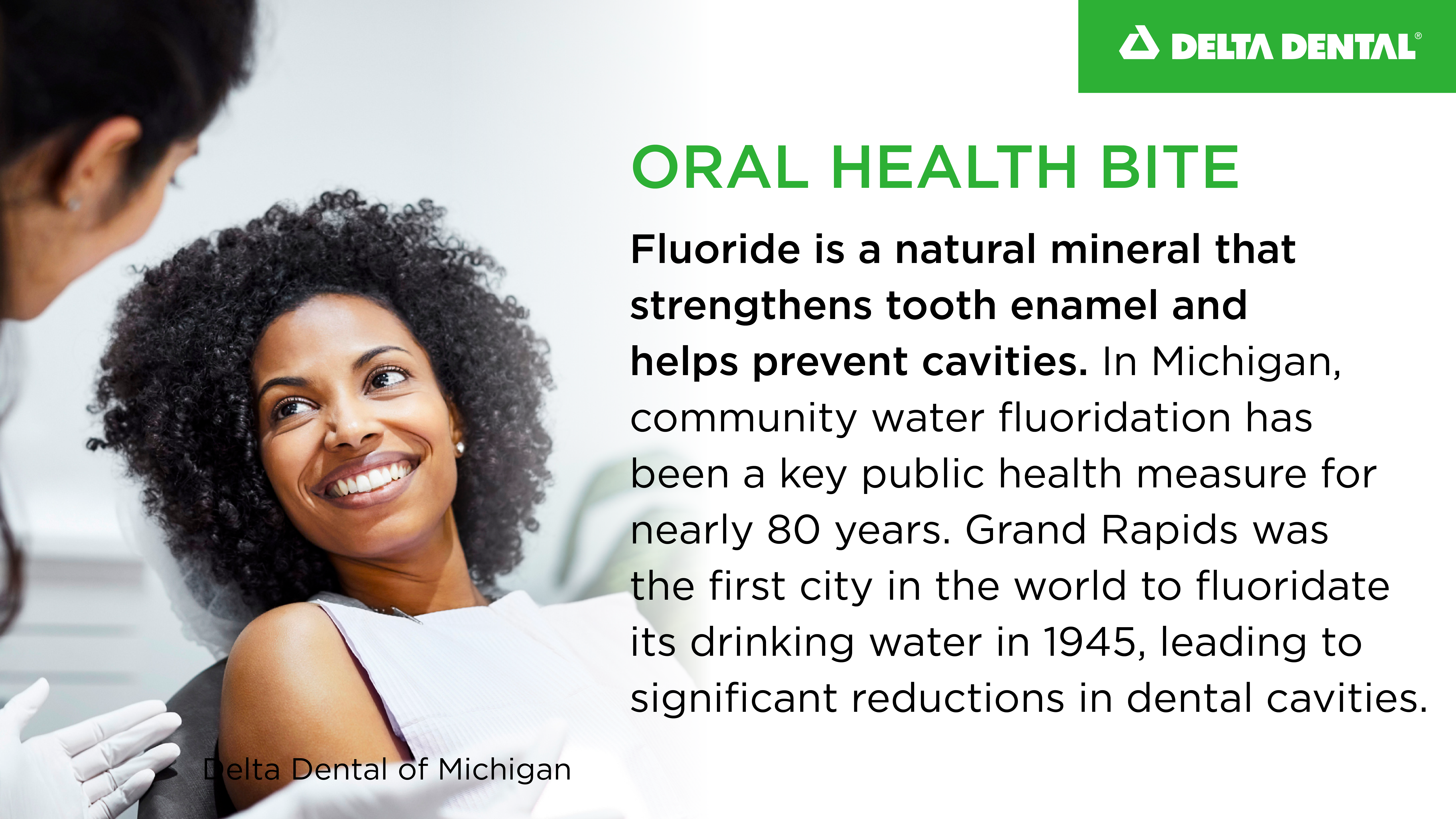 Fluoride is a natural mineral that strengthens tooth enamel and helps prevent cavities. In Michigan, community water fluoridation has been a key public health measure for nearly 80 years. Grand Rapids was the first city in the world to fluoridate its drinking water in 1945, leading to significant reductions in dental cavities. Learn more here.